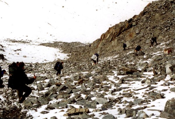 Der Abstieg vom Pass ueber vereistes Geroellfeld