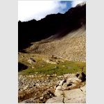 Der Abstieg vom Pass ueber vereistes Geroellfeld